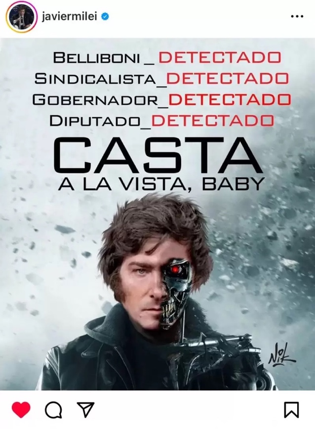 In this example, Milei appropriates the well-known cinematic figure of Terminator, which he re-embodies in order to present himself as the one who will 'terminate' the casta, while also détourning the film’s famous line.