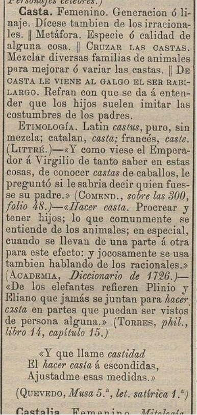 According to the Diccionario general etimológico de la lengua española (Echegaray, 1887), casta would derive from the Latin castus, corresponding to the idea of “purity, without mixture.” Its usage is generally associated with animals, as illustrated by expressions such as “castes of horses” or “to make caste”, defined as “to reproduce and have offspring; what is commonly said of animals.” The definition proposed by this dictionary also refers to “generation or lineage,” with a constant association with the animal world. In his Diccionario crítico etimológico (Corominas, 1984, p. 914), Corominas questions the association with the Latin castus, noting that the lexical evolution of the term remains unclear. According to him, one possible origin lies in the inheritance of “Gothic forms […] *kasts (or perhaps *kasteri), which, in other regions, may have taken the -a ending under the influence of grammatical gender,” without any definitive conclusion being possible. Corominas nevertheless confirms the historical origin of the term’s usage through its association with animal species, adding that around 1516 the Portuguese employed the term to refer to the “castes or hereditary social classes of India, deprived of mixture and contact with others.” This usage subsequently spread widely, including into other languages, while retaining, in his view, an original anchoring in the animal domain. .png)
