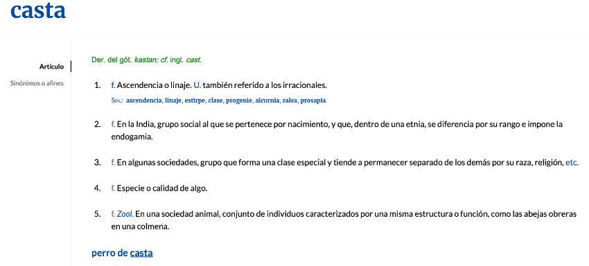 It can be observed that this usage persists and that contemporary definitions preserve the two main historically associated meanings. The lexeme casta is thus defined by the Real Academia Española (RAE, 2024) as ancestry or lineage, with a specific use referring, in India and in certain societies, to a group belonging to a “special class” separated from others. More generally, it may also refer to a species or a quality. Finally, the zoological definition—perro de casta (“purebred dog”)—refers to a categorization based on genetic continuity. This last usage is not insignificant, insofar as it represents one of the most frequent contexts in which the term is employed.