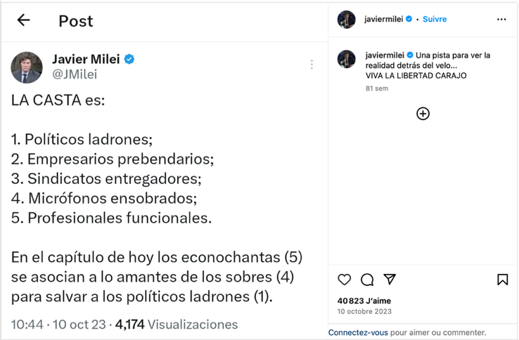 Designating the political adversary through the term casta constitutes, in Javier Milei’s discourse, a particularly salient act of nomination. The choice of this lexeme, which is relatively infrequent in the contemporary Latin American context, confers upon this designation a force of singularization that goes beyond the mere denunciation of the “political class.” By mobilizing casta as a global label, Milei does not simply identify institutional actors; he aggregates heterogeneous figures under a single signifier, presented as jointly responsible for a systemic dysfunction. .png)
