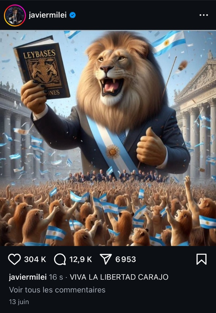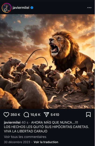 The disqualifying categorization constructed through the term casta is not limited to the verbal register. It is accompanied by an iconographic strategy that reactivates the lexeme’s original association with animal classification. Images disseminated by Milei on social media—particularly those generated by artificial intelligence—systematically oppose a “we” represented by the lion (left) to a “they” assimilated to rats (right), thereby reinforcing moral polarization and the heroic ethos of the speaker at a semiotic level.